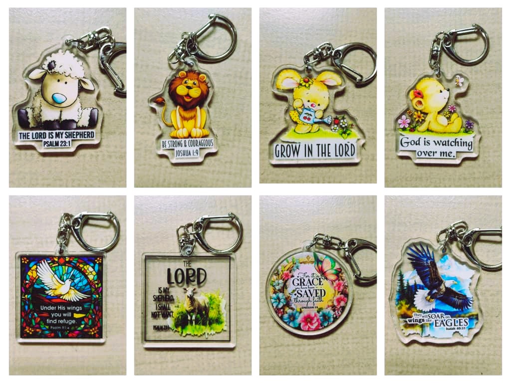 Beautiful Christian acrylic keychains with assorted Bible verse and inspirational designs.