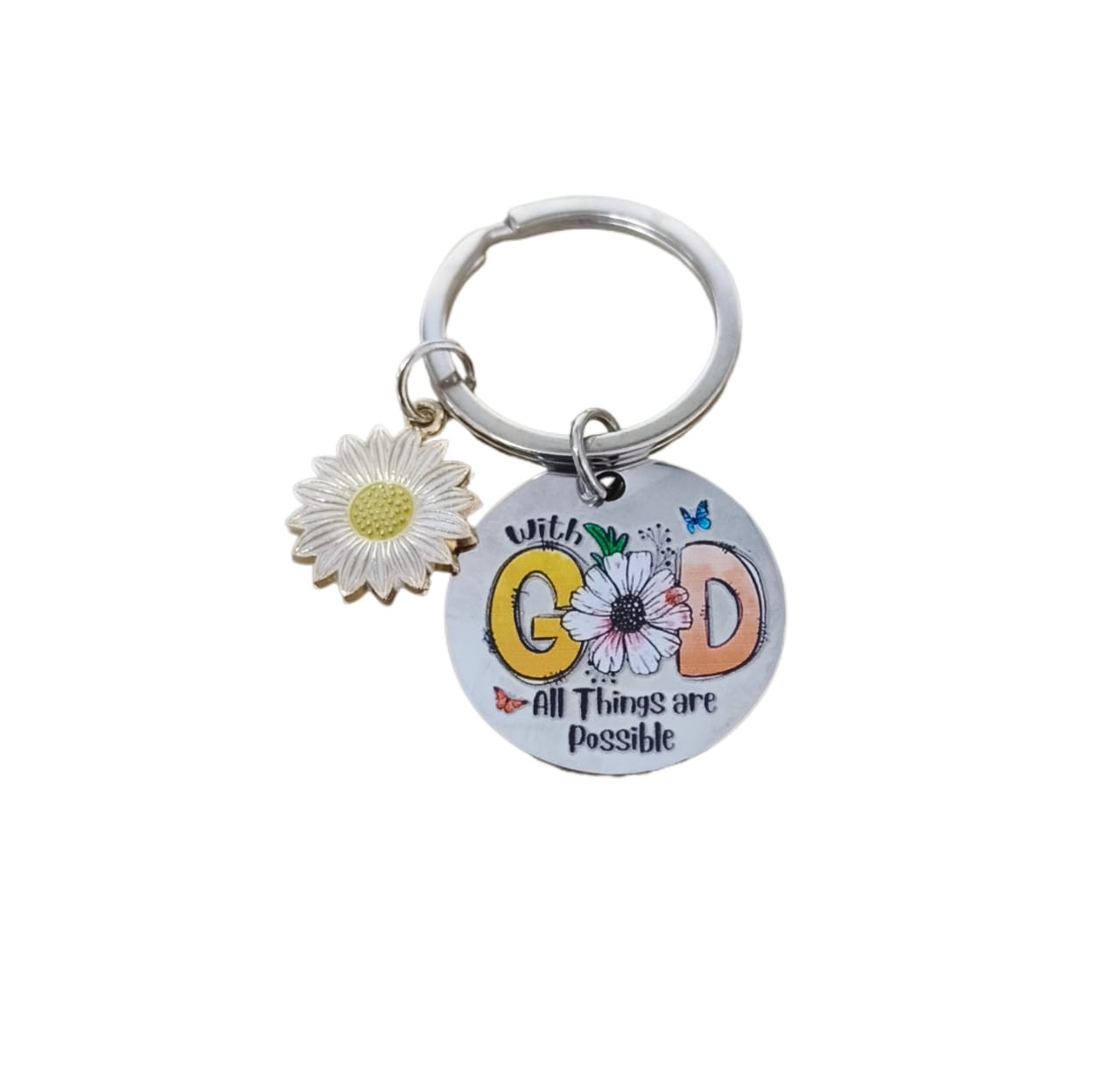 A meaningful stainless steel Christian keychain featuring the encouraging message “With God All Things Are Possible.” Designed with a round printed charm and a delicate floral accent, this keychain is small, lightweight, and perfect for everyday use or gifting.